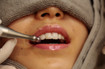 | 歯の表面に、最新の専用薬剤を塗布 していきます。 | 専用のLEDライトを約8分間照射します。薬剤塗布・LEDライト照射の施術を2セット行います。 | |